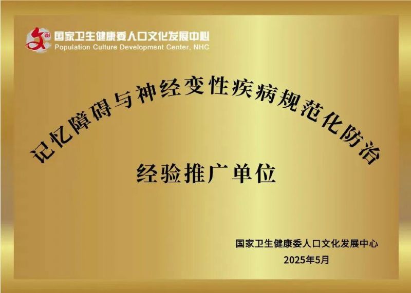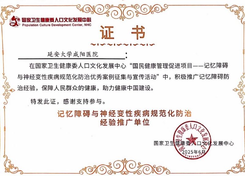 延安大學(xué)咸陽(yáng)醫(yī)院認(rèn)知障礙??平衲暝佾@國(guó)家級(jí)殊榮—成功斬獲由國(guó)家衛(wèi)生健康委人口文化發(fā)展中心授予的“記憶障礙與神經(jīng)變性疾病規(guī)范化防治經(jīng)驗(yàn)推廣單位”稱號(hào)。此次全國(guó)僅43家醫(yī)療機(jī)構(gòu)入選,標(biāo)志著醫(yī)院在認(rèn)知障礙領(lǐng)域的診療實(shí)力與推廣能力獲得國(guó)家級(jí)權(quán)威認(rèn)可。